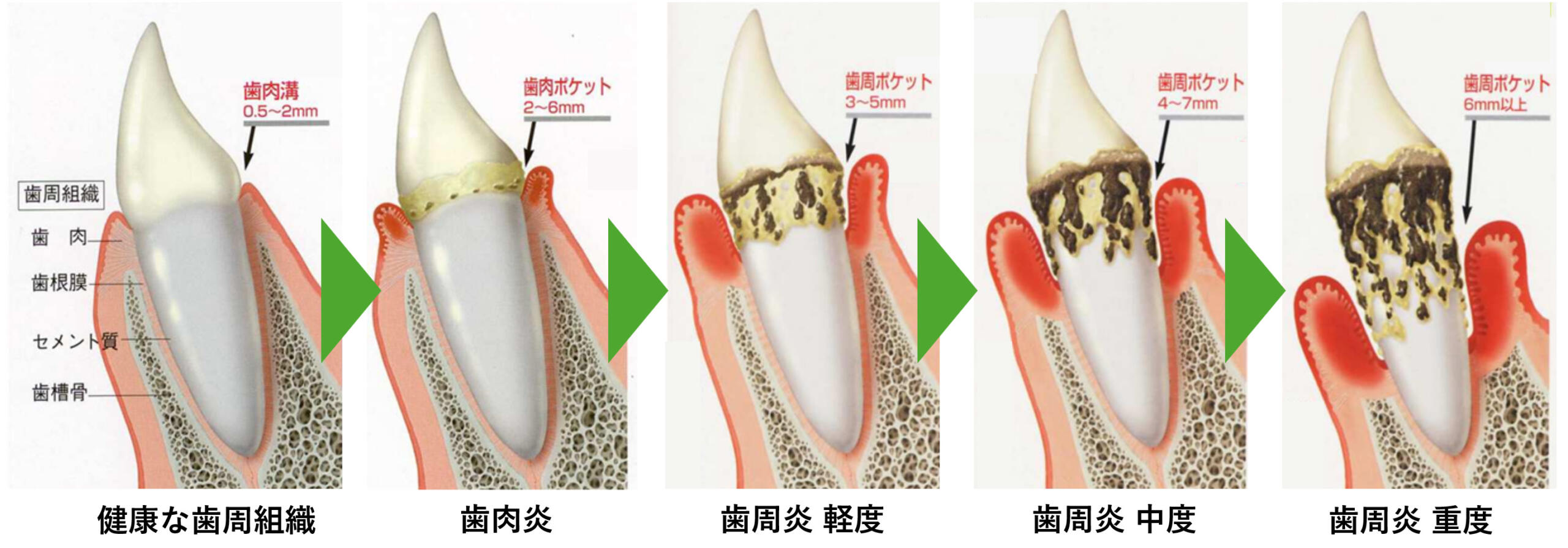 プラークが歯肉溝(通常0.5〜2mm)に侵入すると、免疫細胞との攻防によって歯肉が炎症を起こし「歯肉炎」が発生します。この段階では適切なケアによって健康な状態に戻すことが可能です。しかし、炎症が長期間続くと、歯槽骨や歯根膜といった歯周組織が破壊され、「歯周炎」へと進行します。ここまで進むと完全に元に戻すことは難しく、重度の場合は歯が抜け落ちてしまうこともあります。