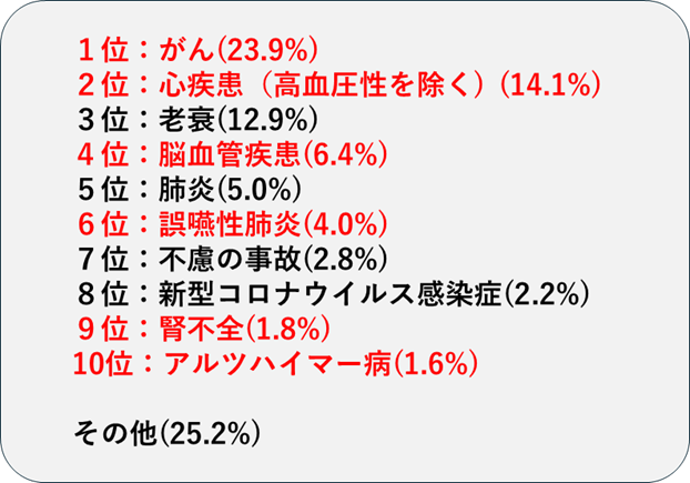 歯周病は、なんと日本人の死亡原因トップ10のうち6つが歯周病と関連しているとされています。