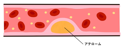 歯茎の炎症(歯周病)が続くと、歯周病菌や炎症物質が血管に入り込み、血管の壁を傷つけます。体がその傷を修復しようと、コレステロールなどが溜まって「アテローム」ができ、血管が狭く硬くなって動脈硬化が進みます。